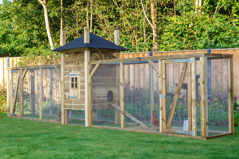 Chicken enclosure made from low-maintenance preserved wood.