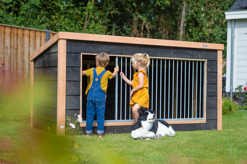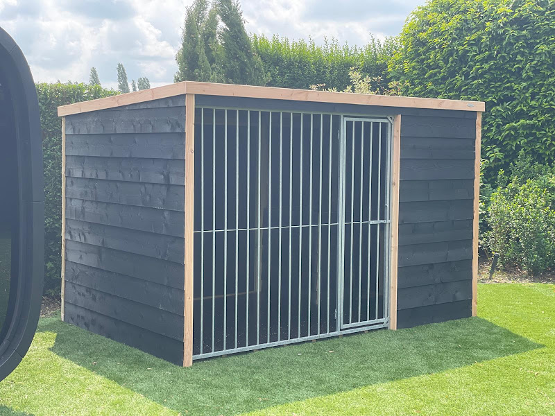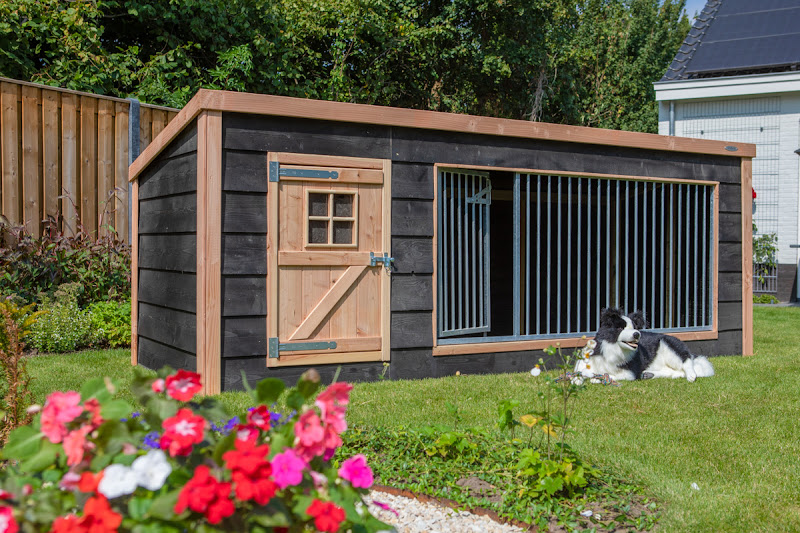 Houten hondenkennel van duurzame onderhoudsloose materialen.