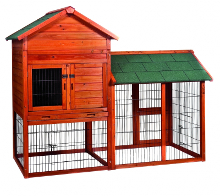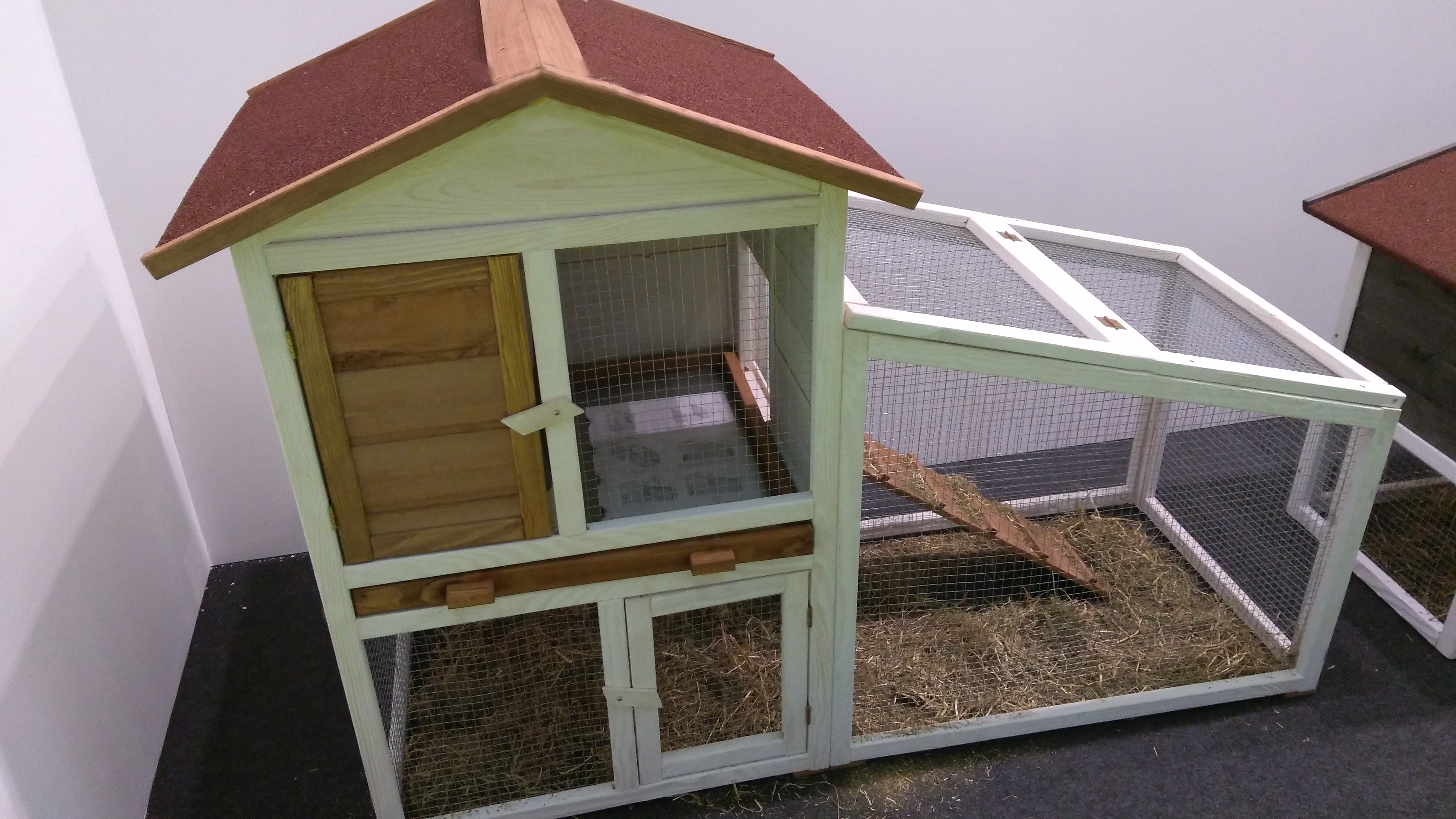 Zeer ruim konijnenhok met grote overdekte buitenren, roofing dakbedekking, mestlade, ladder, reeds geverfd,...