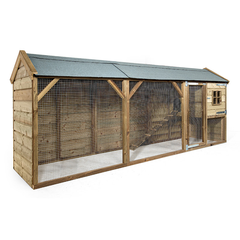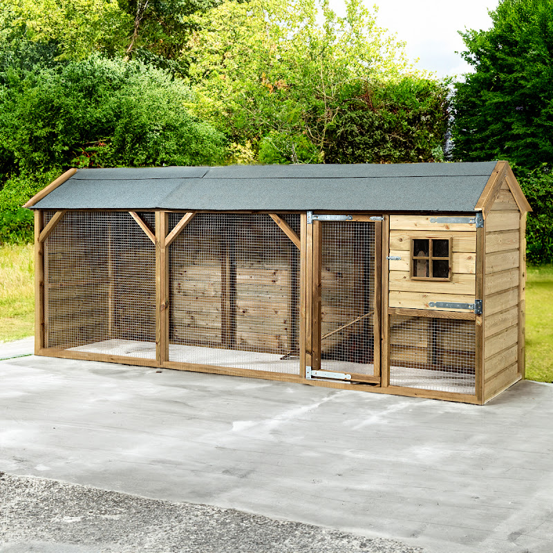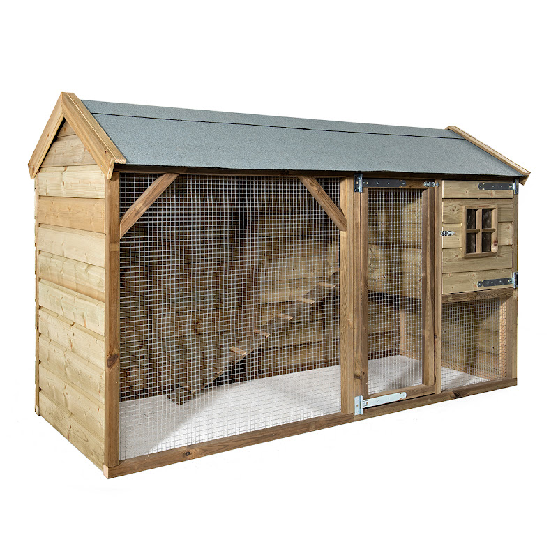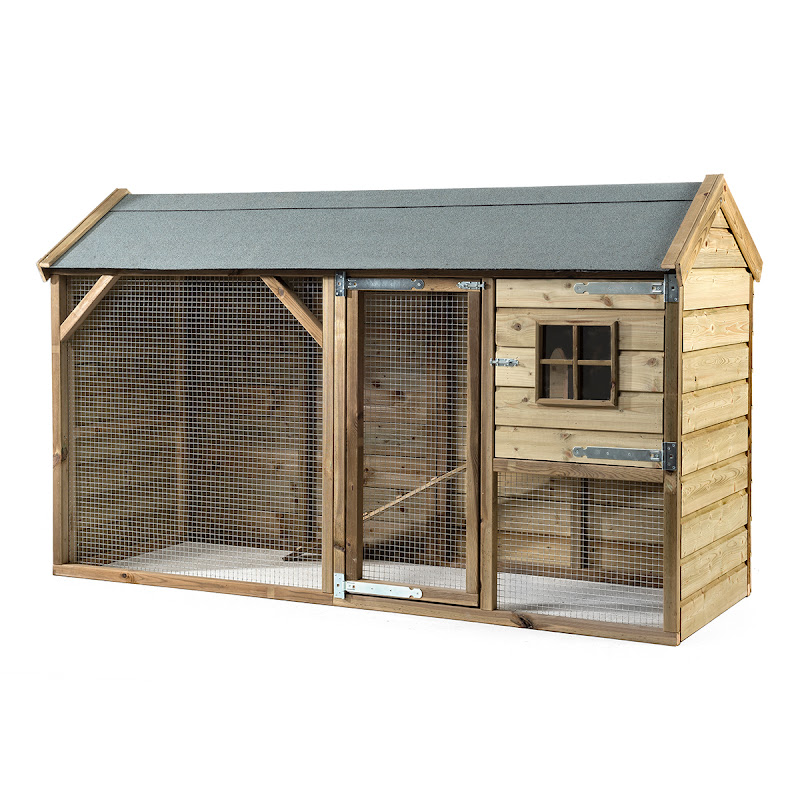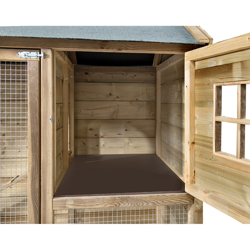Het hok is reeds volledig gebeitst en kan onmiddelijk in gebruik genomen worden. De legnest is links of rechts te monteren en aan de andere zijde heeft u een plexi raam.