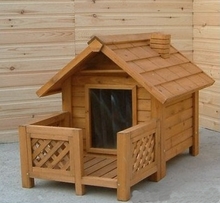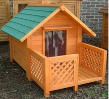 Een stijlvol en groot hondenhok met overdekte veranda voor extra ruimte.