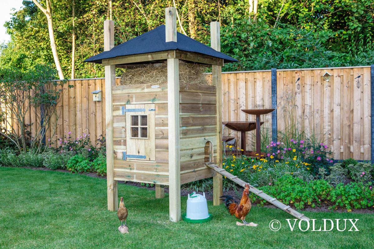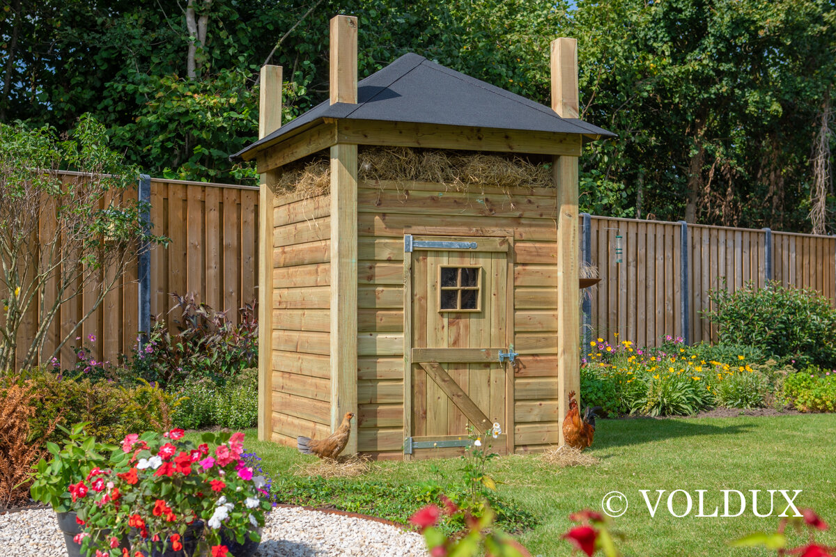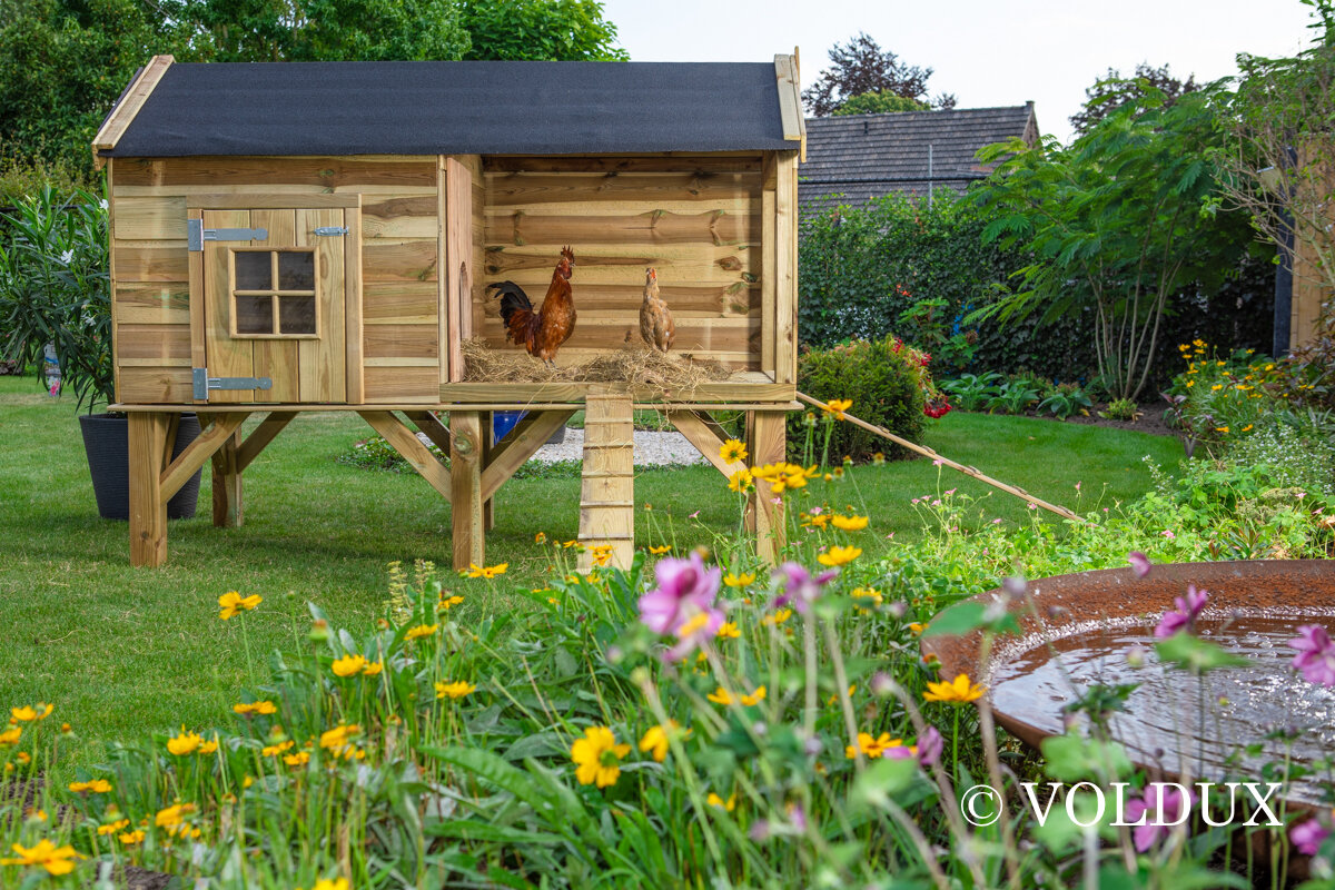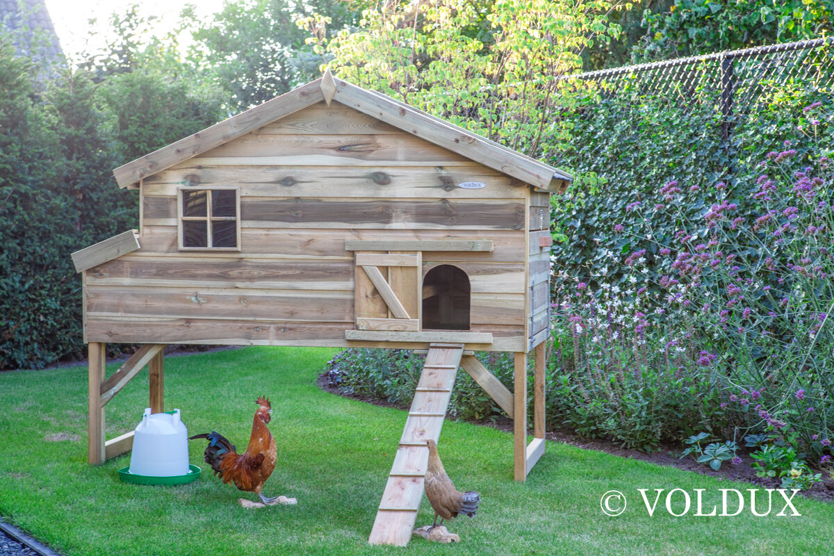 Kippenhok dennis 1, gemaakt uit geimpregneerd hout op een verhoog.