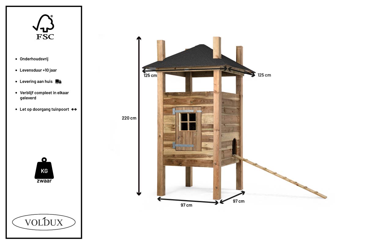 Dakbedekking kan gekozen worden tussen roofing met aluminium omlijsting of betonplex (randen zijn behandeld), uitneembare zitstok en ladder zijn voorzien.