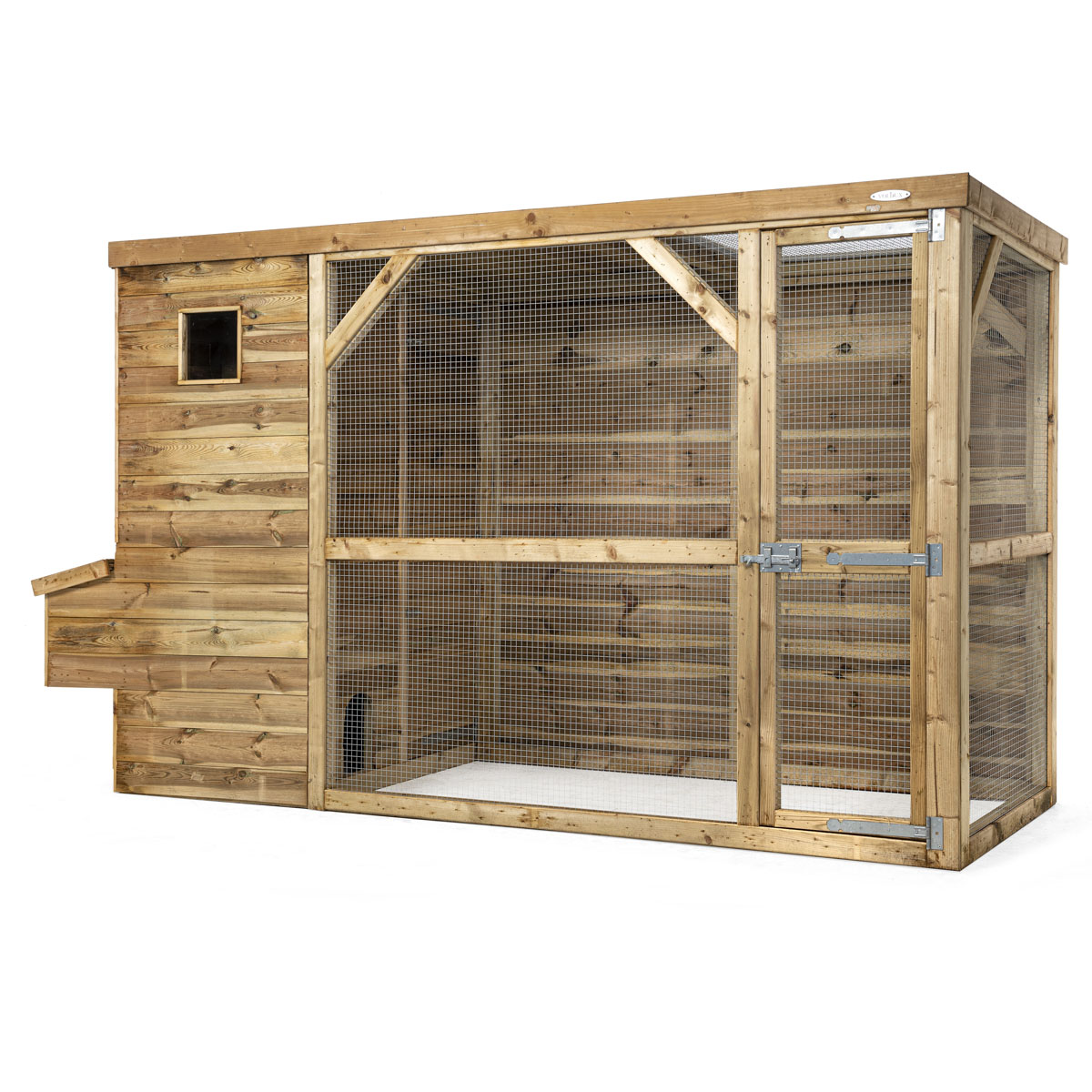 Achteraan een ruime deur voor een goede bereikbaarheid binnenin het hok, 2 degelijke zitstokken en 2 legnesten zijn voorzien in dit kippenhok.