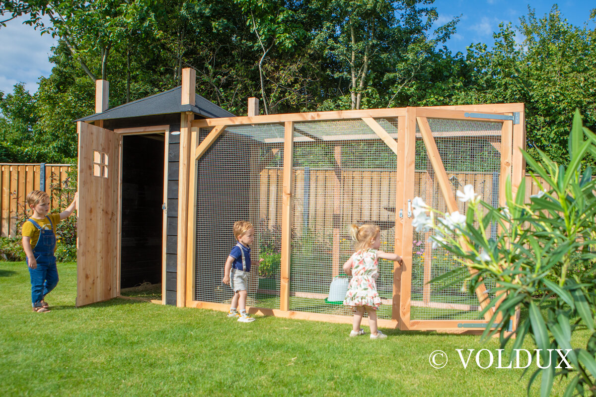 Voorzien van een grote deur aan het nachthok en aan de buitenren.