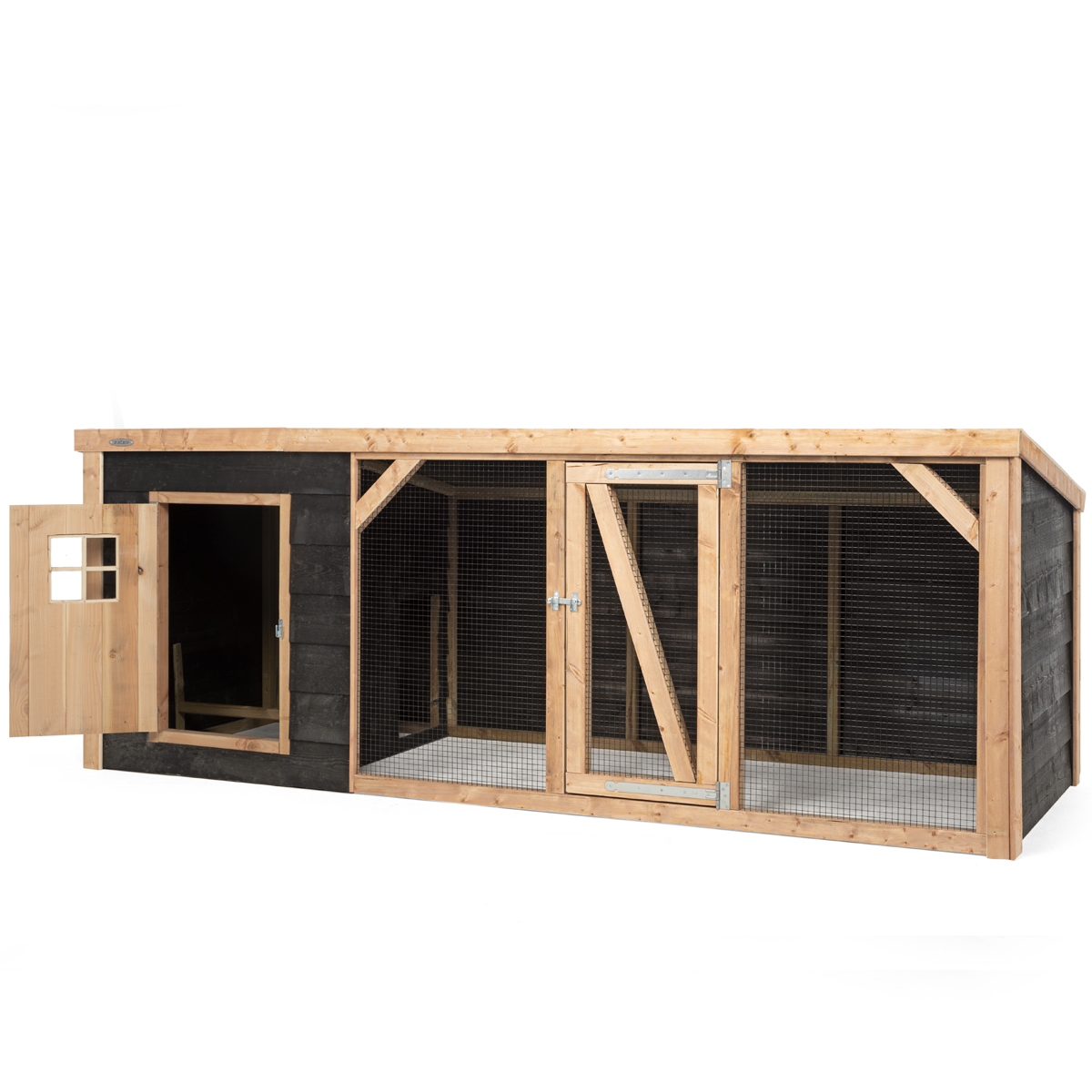 Voorzien van een grote deur aan de voorzijde zodat het hok vlot toegankelijk is en gemakkelijk te reinigen