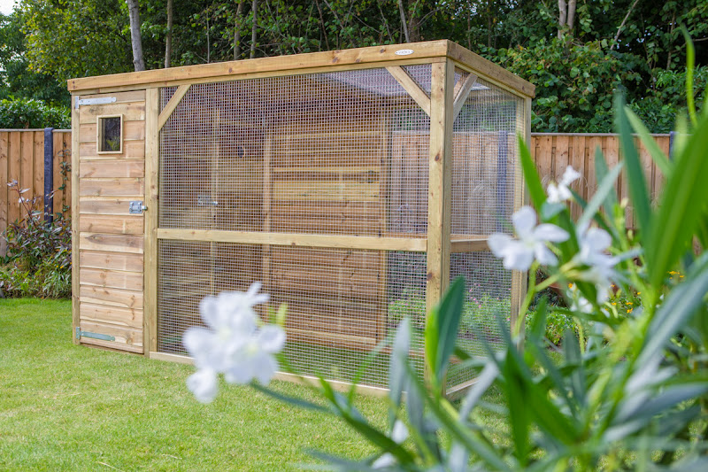 Volière met ruim nachthok voorzien van dubbele toegangsdeur tegen ontsnappen.