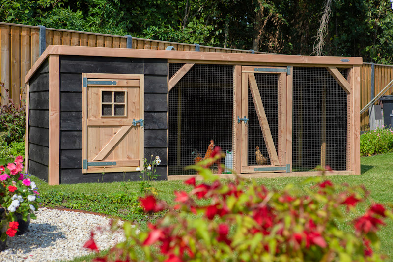 Le poulailler est construit à partir d'une structure en pin imprégné et fini avec un couvercle de pot noir et des détails Douglas.