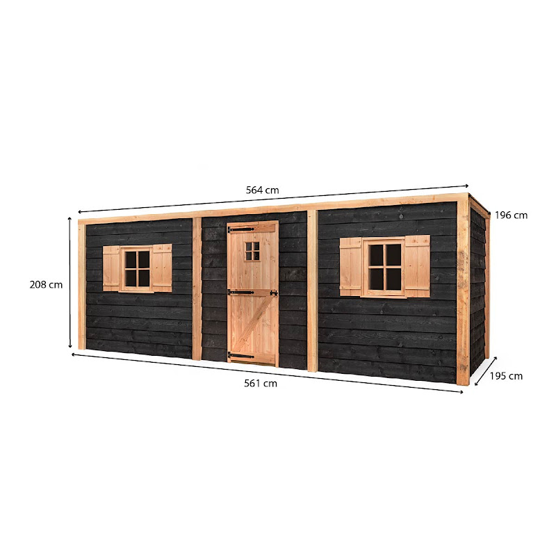 Dimensions extérieures de 564 x 196 x 208 cm.