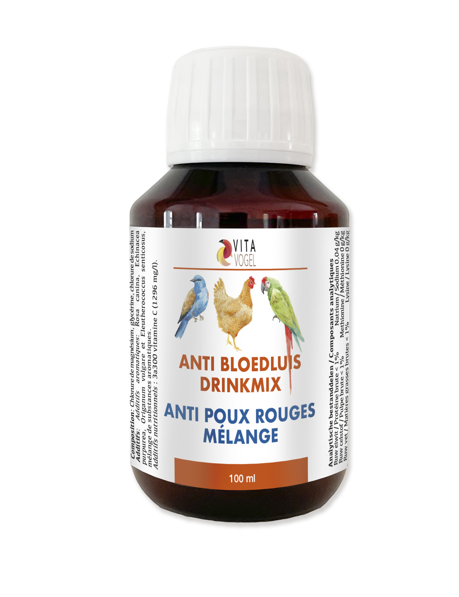 Bestel nu de Anti Bloedluis Drinkmix 100ml van VITA VOGEL en help uw siervogels en kippen hun gezondheid te ondersteunen!